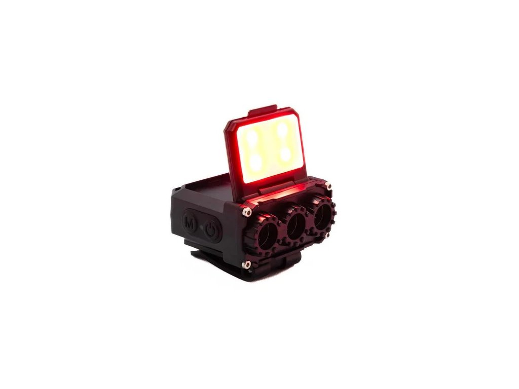 Jedním tlačítkem přepínáte mezi předním bílým světlem, bočním širokým světlem, kombinovaným režimem i červeným signalizačním světlem (stálé nebo blikání).
